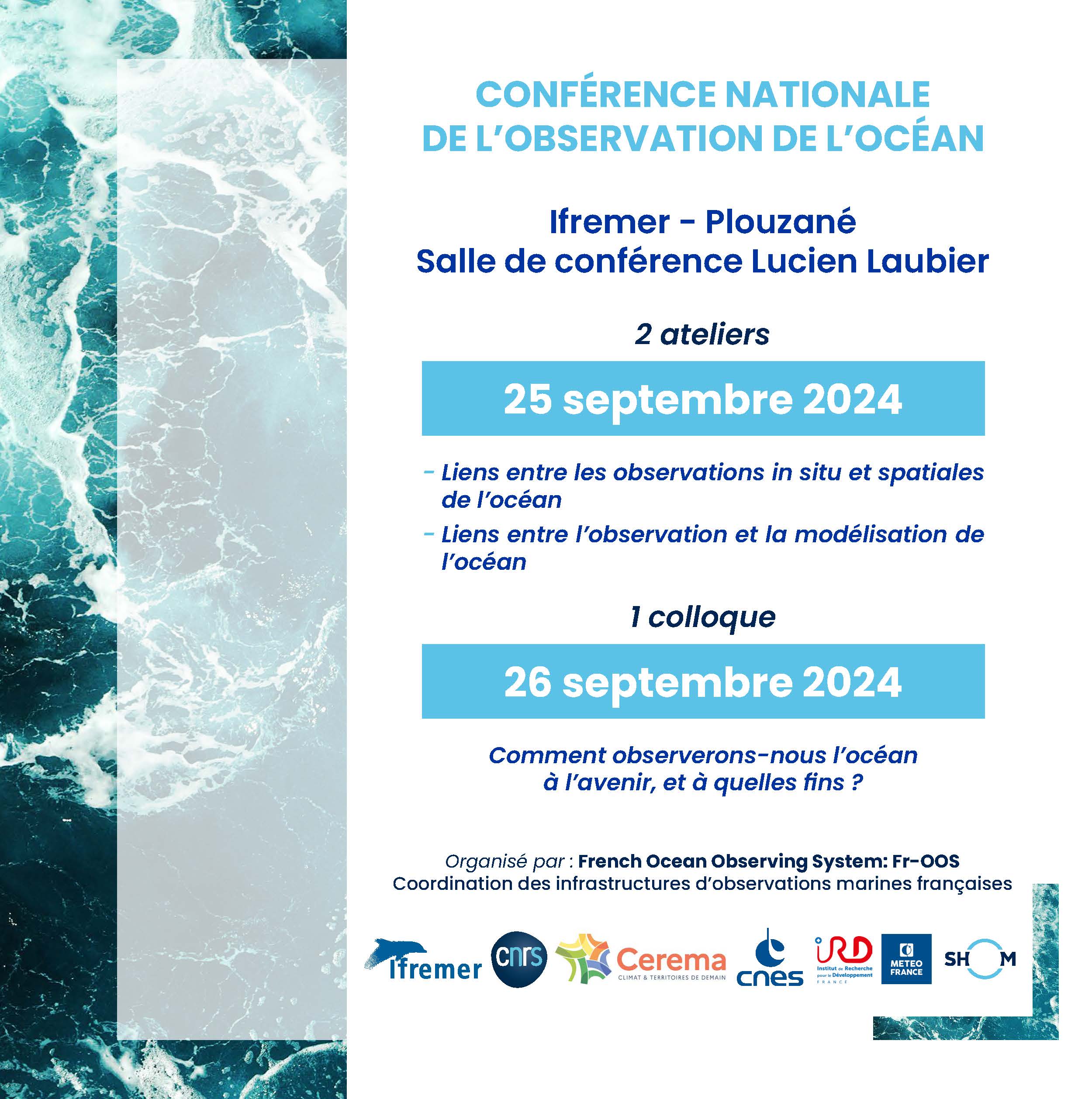 Le Fr-OOS (French Ocean Observing System) organise deux journées les 25 et 26 septembre 2024 au centre Ifremer de Brest. La première journée propose deux ateliers ouverts à tous et en particulier aux membres des réseaux et infrastructures du Fr-OOS et aux acteurs nationaux du spatial et de la modélisation. La deuxième journée est une conférence ouverte à toute la communauté scientifique océanographique.