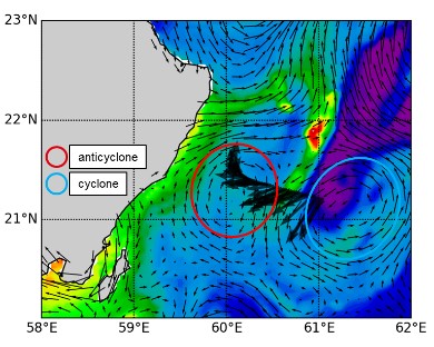 *Un tourbillon océanique est une structure circulaire, de rayon compris entre 20 et 200 km, qui tourne rapidement autour de son centre. Sa vitesse de rotation est généralement bien plus élevée que sa vitesse de déplacement, ce qui a pour effet de piéger l’eau, le plancton et d’autres particules à l’intérieur de la structure.